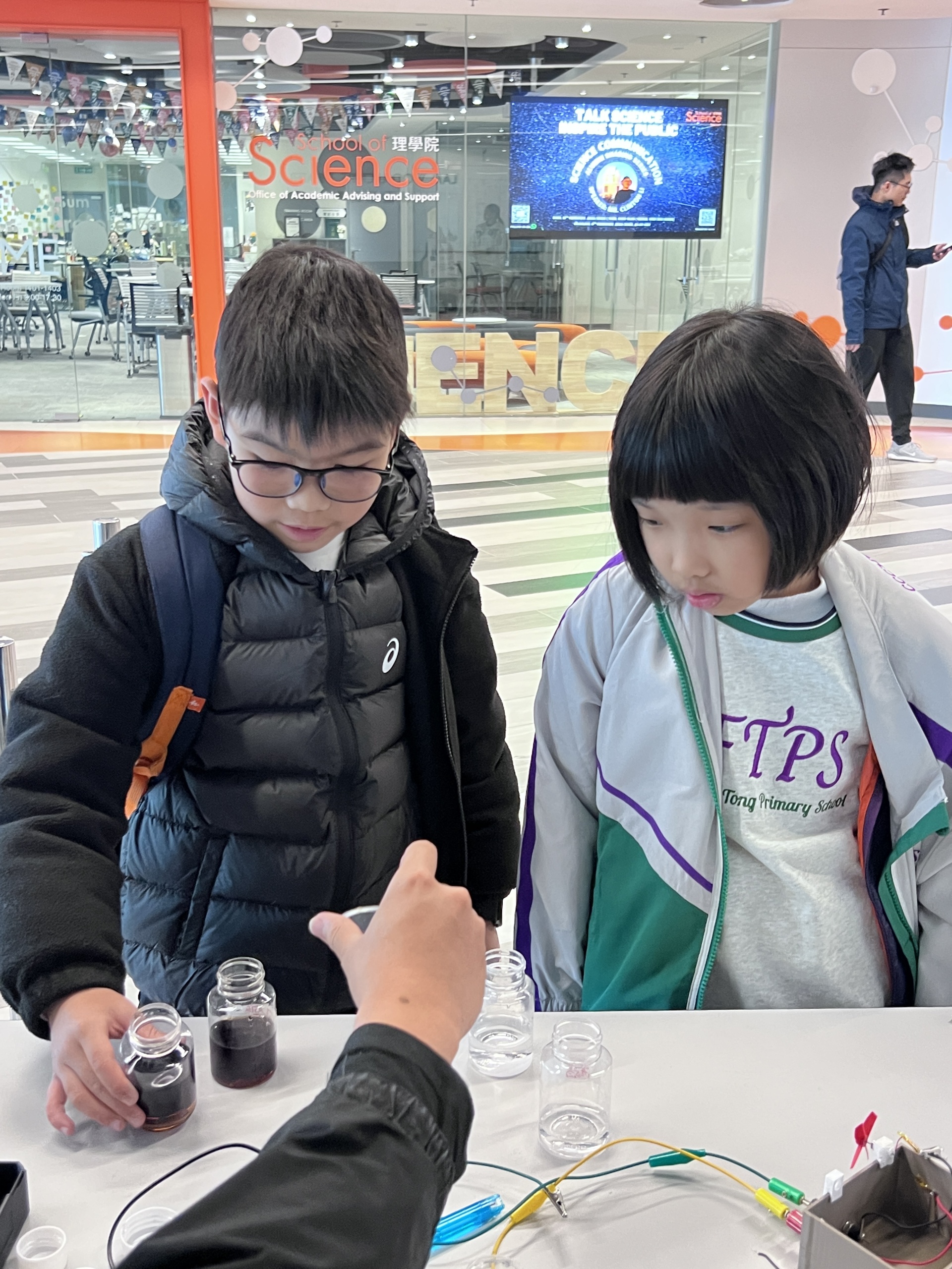 學生在互動遊戲攤位體驗不同科技、動手做小實驗,使用 Micro:bit 挑戰各種任務,一邊玩一邊學 ,學習不同科學知識。